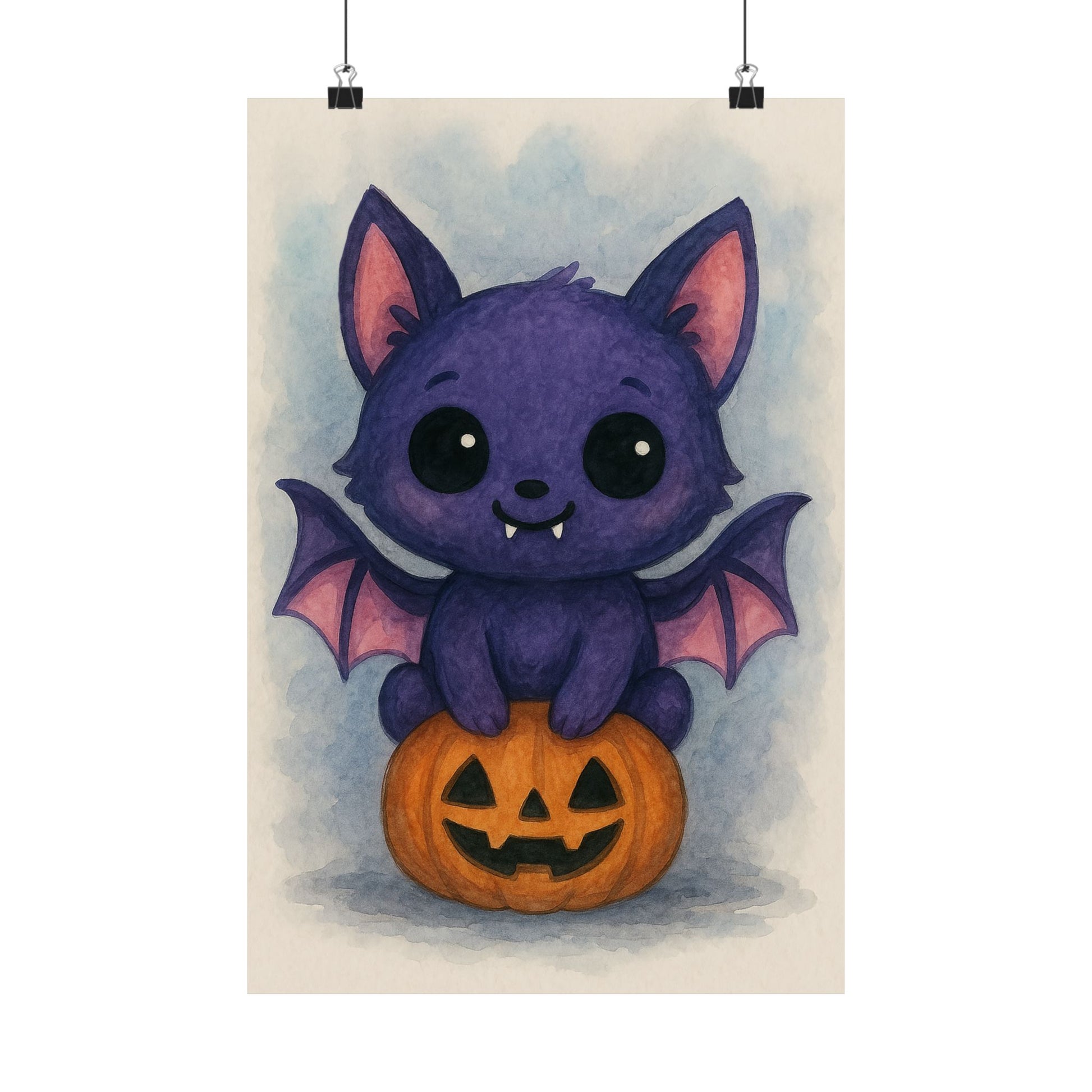 Cute Baby Bat Halloween Wall Art Poster – Watercolor Monster Print on Pumpkin – Whimsical Nursery & Holiday Decor