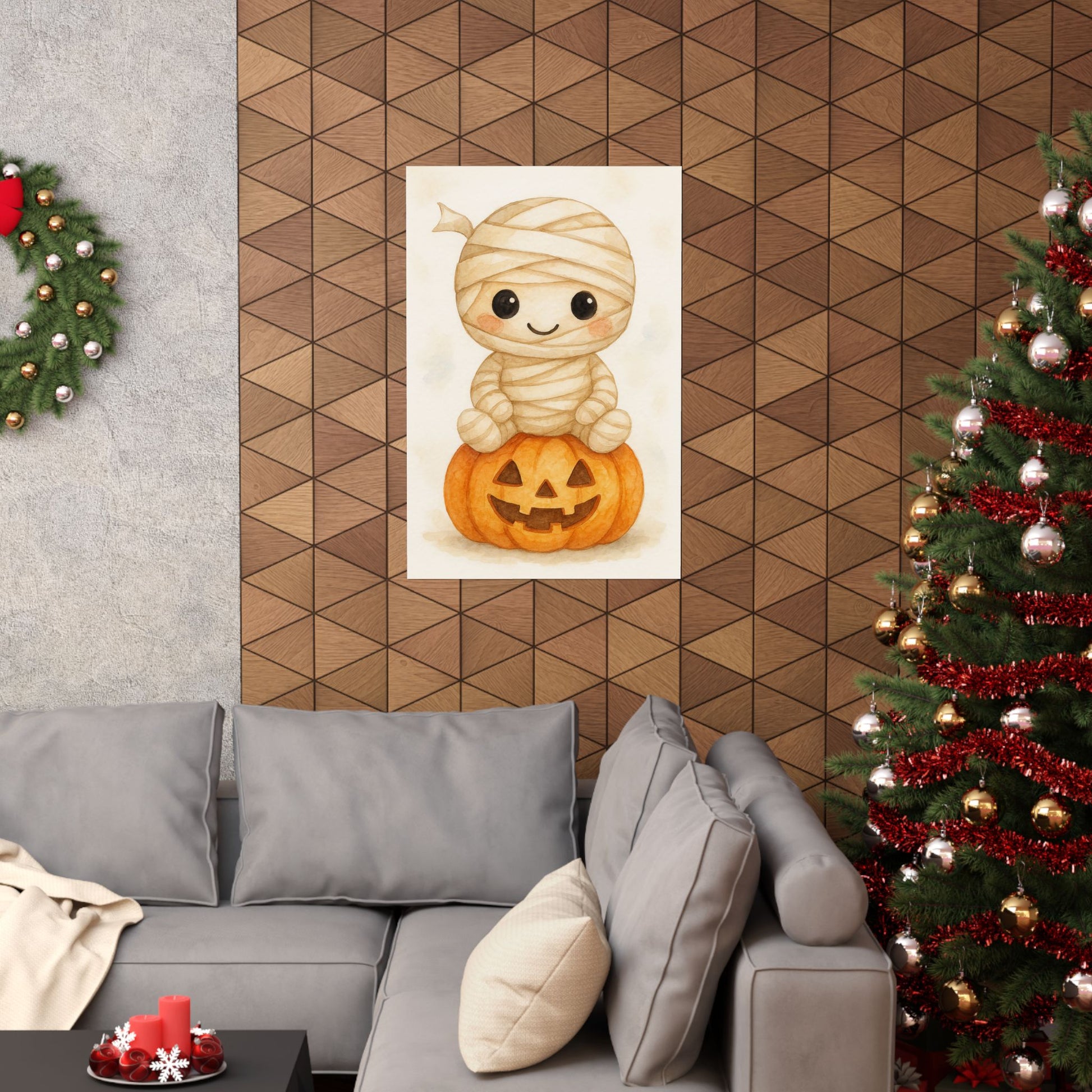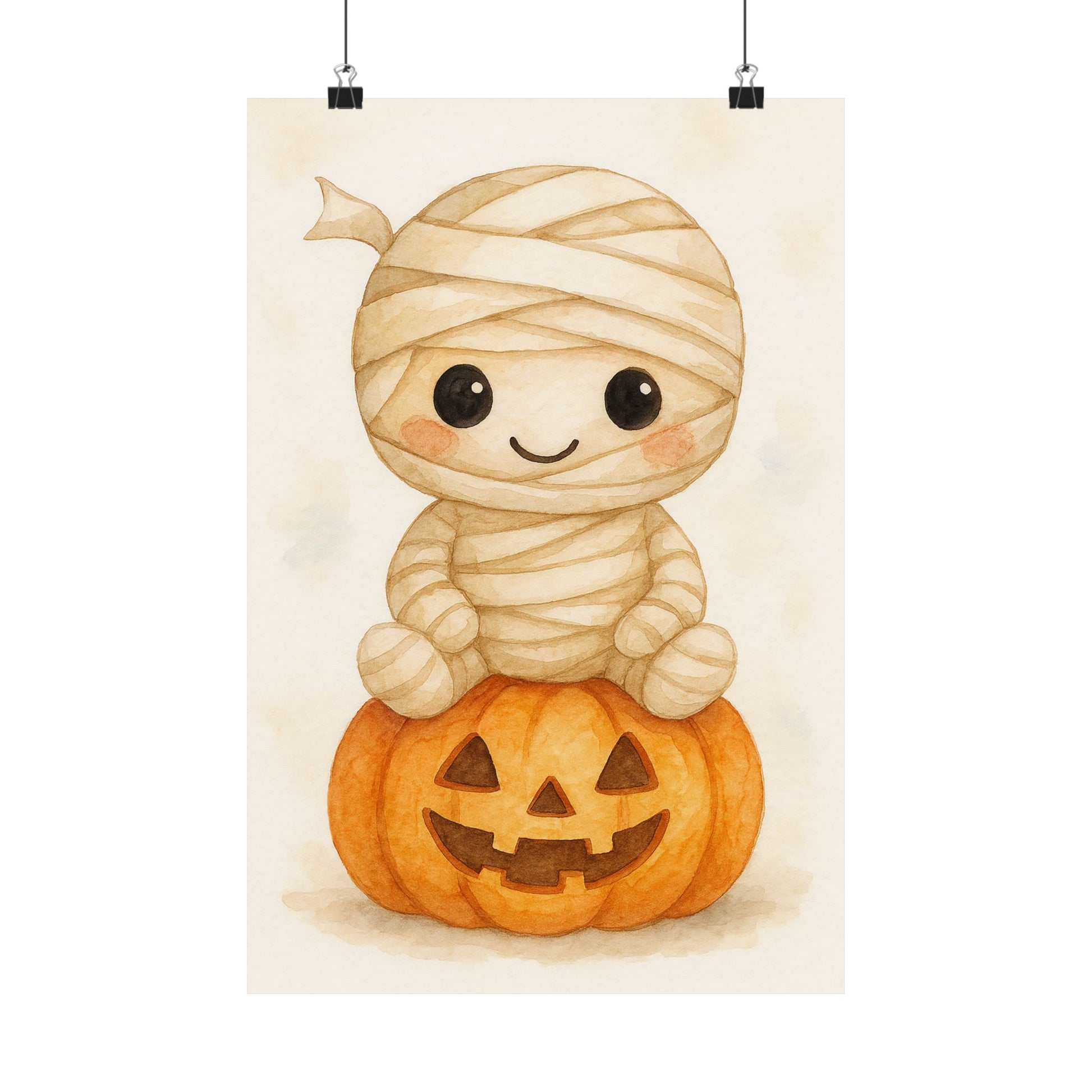 Cute Baby Mummy Monster Halloween Wall Art Poster – Watercolor Monster Print on Pumpkin – Whimsical Nursery & Holiday Decor