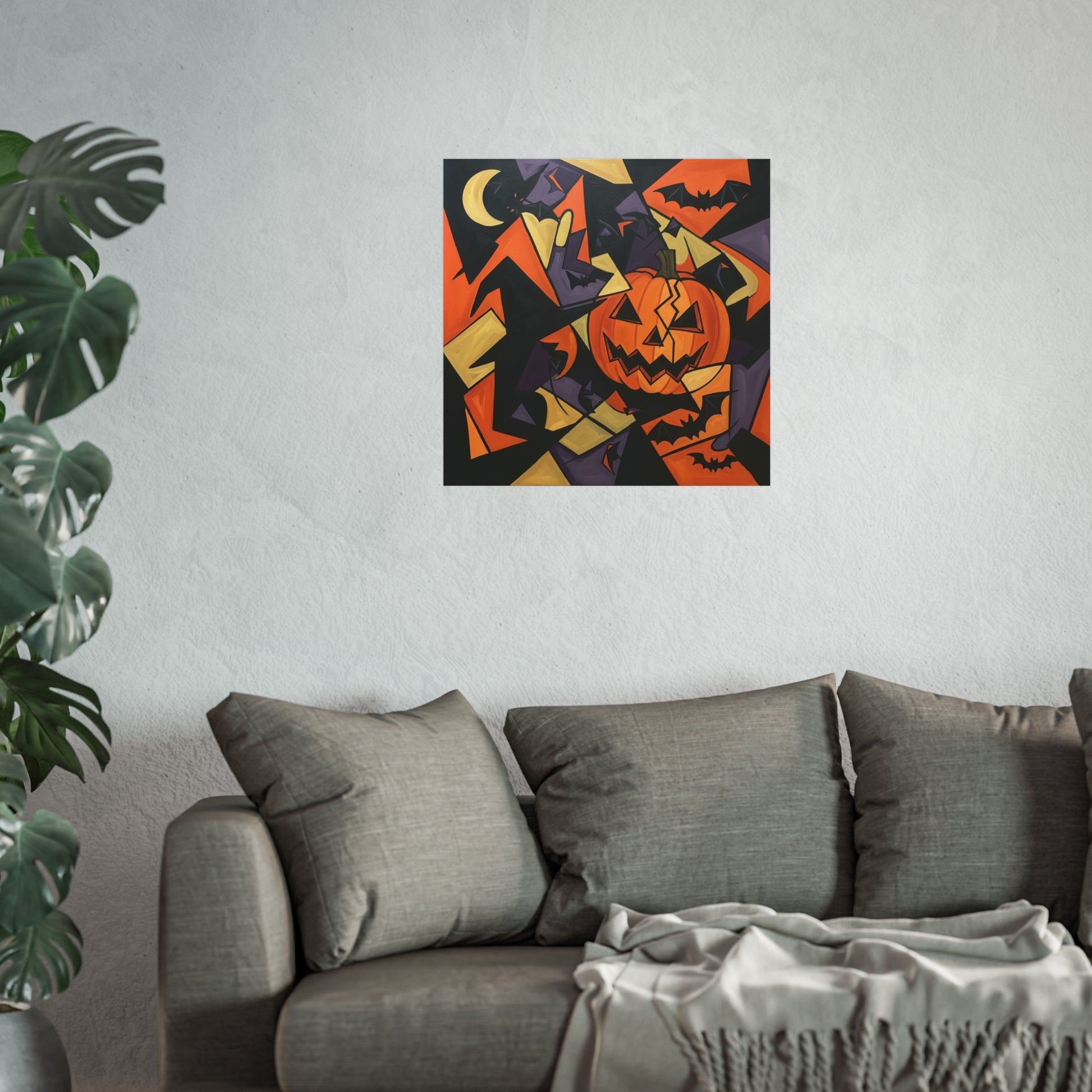 Celebrate Halloween with bold artistic flair through this cubist-inspired fine art poster. Featuring a fractured jack-oβ-lantern surrounded by bats, crescent moons, and geometric shapes in vivid orange, purple, and black, this artwork transforms traditional spooky imagery into a modern abstract masterpiece.