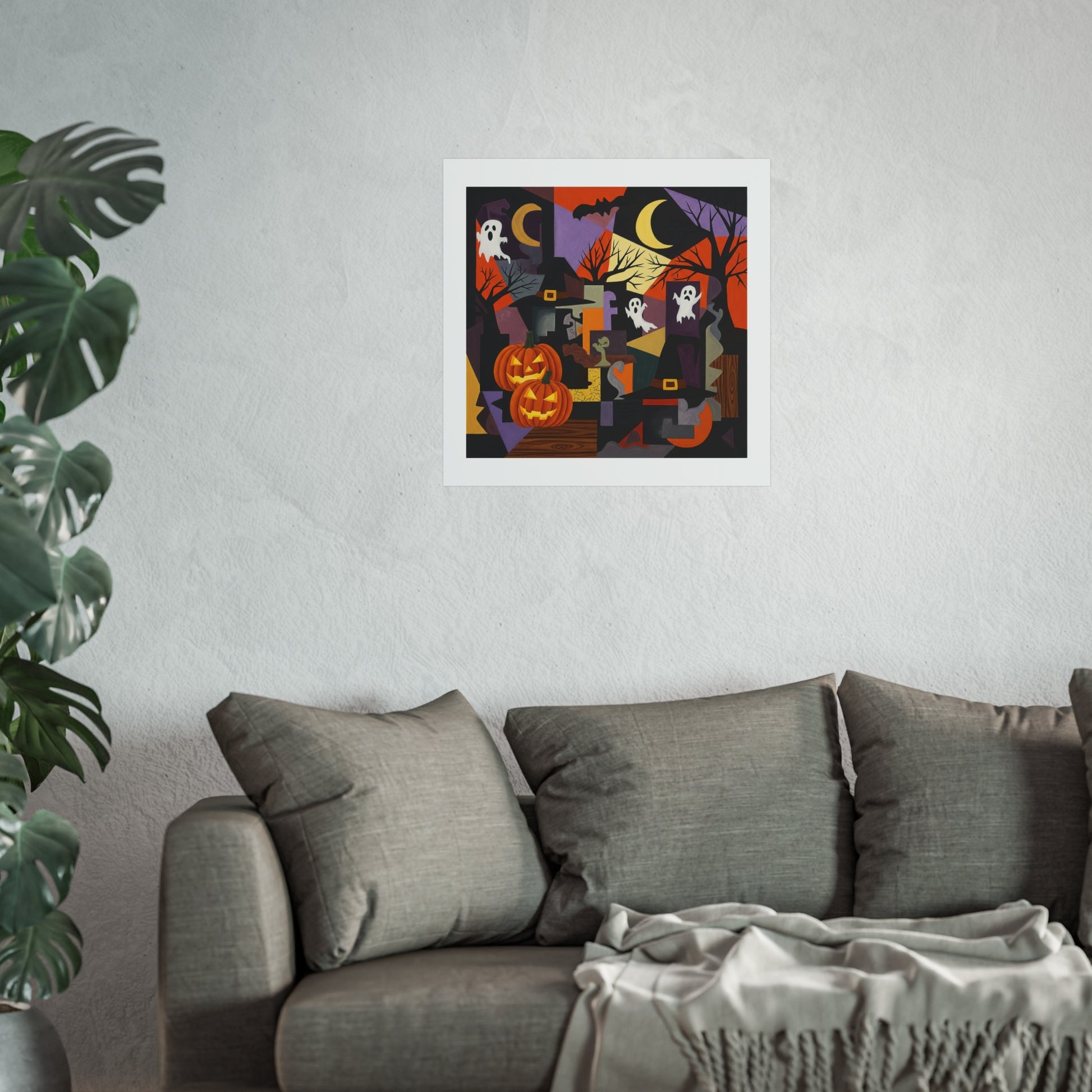 Halloween Cubist Abstract Fine Art Print – Pumpkins, Ghosts & Haunted Night Wall Art Poster, Modern Spooky Autumn Decor