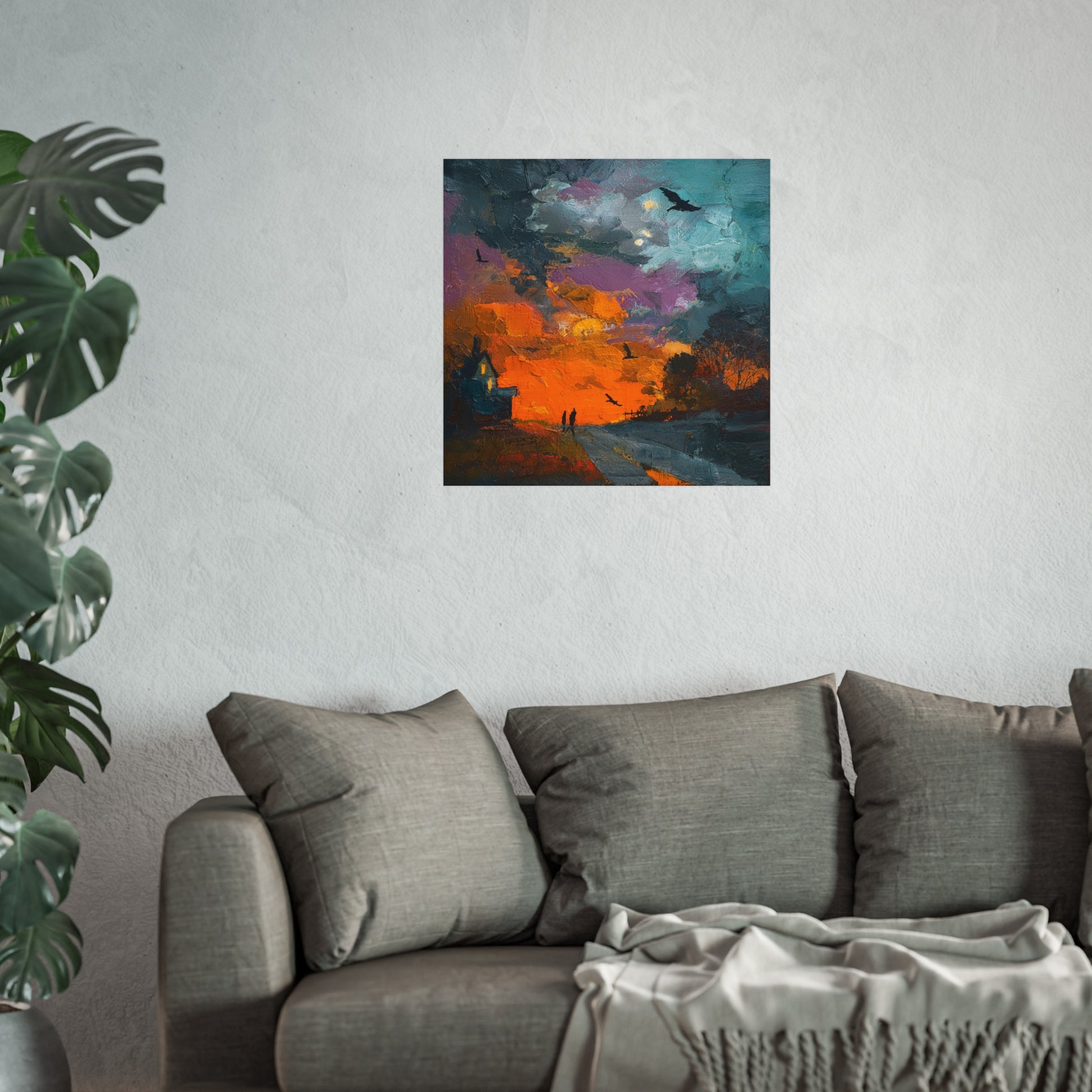 Capture the eerie beauty of Halloween nights with this abstract fine art poster. Painted with bold, textured strokes in fiery oranges, haunting purples, deep blues, and stormy grays, this artwork depicts a moody landscape featuring a silhouetted house, soaring black crows, and figures walking beneath a glowing, otherworldly sky.