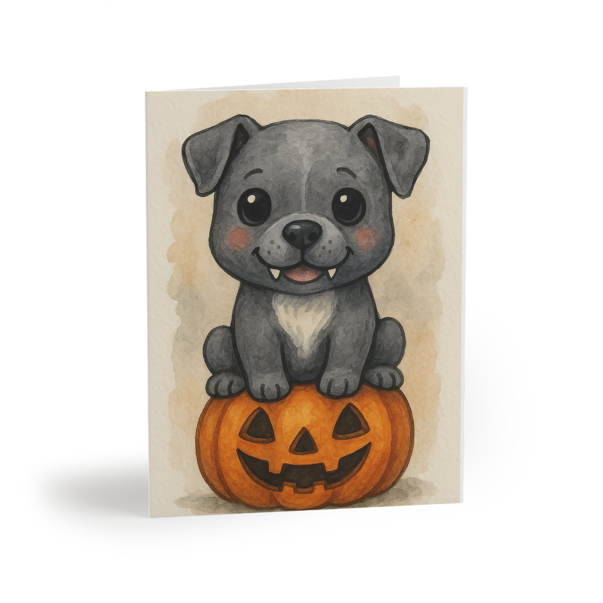 Perfect for Pitbull lovers, dog parents, or anyone who adores spooky-cute art, this greeting card makes a charming choice for Halloween wishes, party invitations, or gifting alongside seasonal treats.