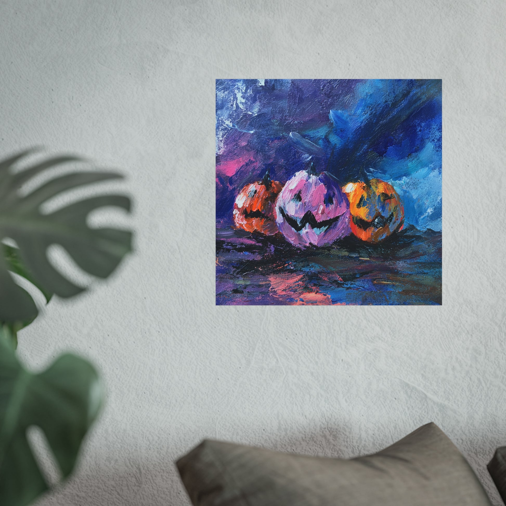 Celebrate the playful spirit of Halloween with this abstract fine art poster featuring three expressive jack-o’-lanterns painted in bold, textured brushstrokes. Shades of vibrant orange, striking purple, and midnight blue create a dramatic, otherworldly backdrop that makes the pumpkins pop with mischievous charm.