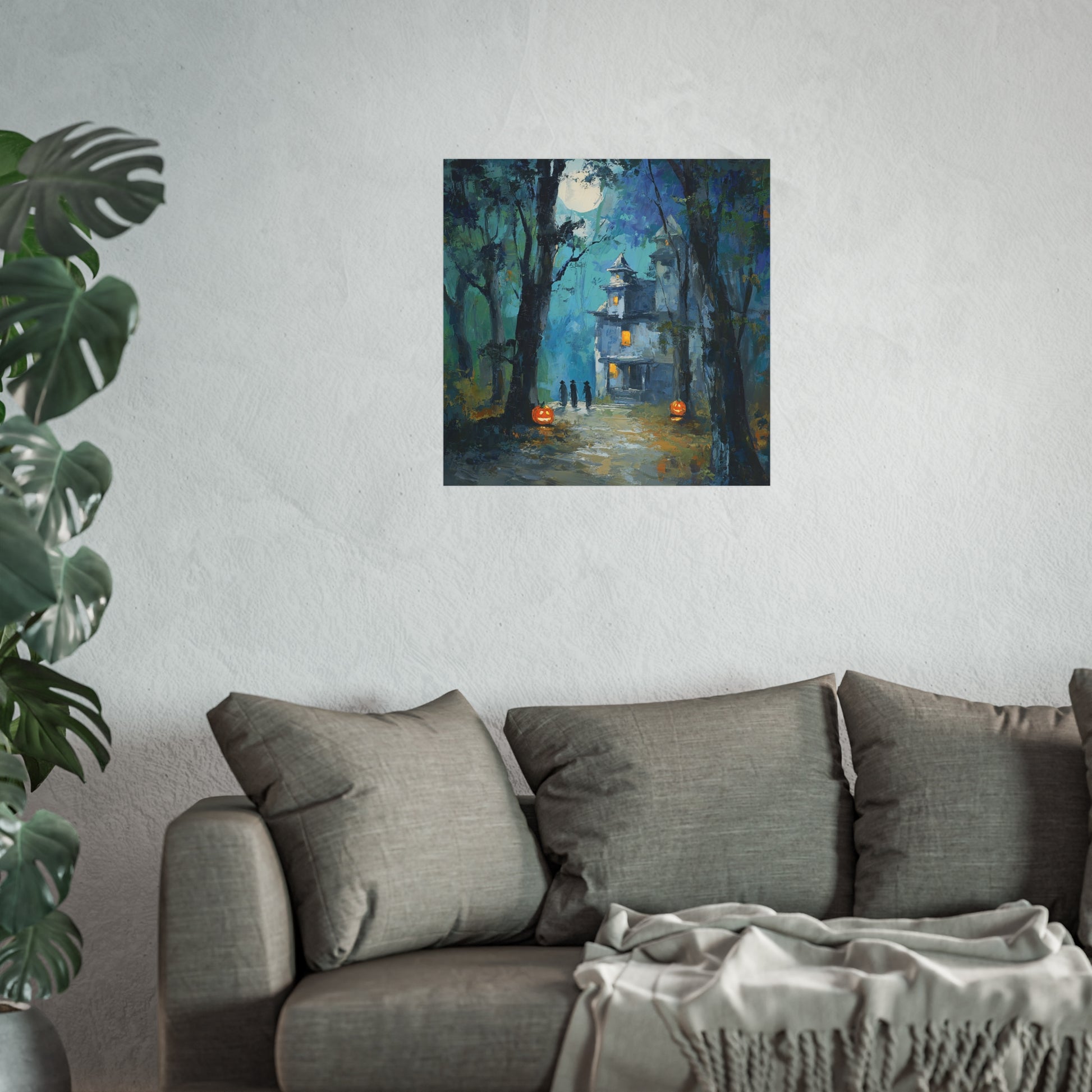 Step into a world of eerie beauty with this Haunted House Halloween Fine Art Poster. Painted in a rich painterly style, the scene features a looming Victorian house bathed in moonlight, framed by towering trees. Two glowing jack-o’-lanterns mark the path as three mysterious witch-like figures approach, creating an atmosphere of suspense and intrigue.