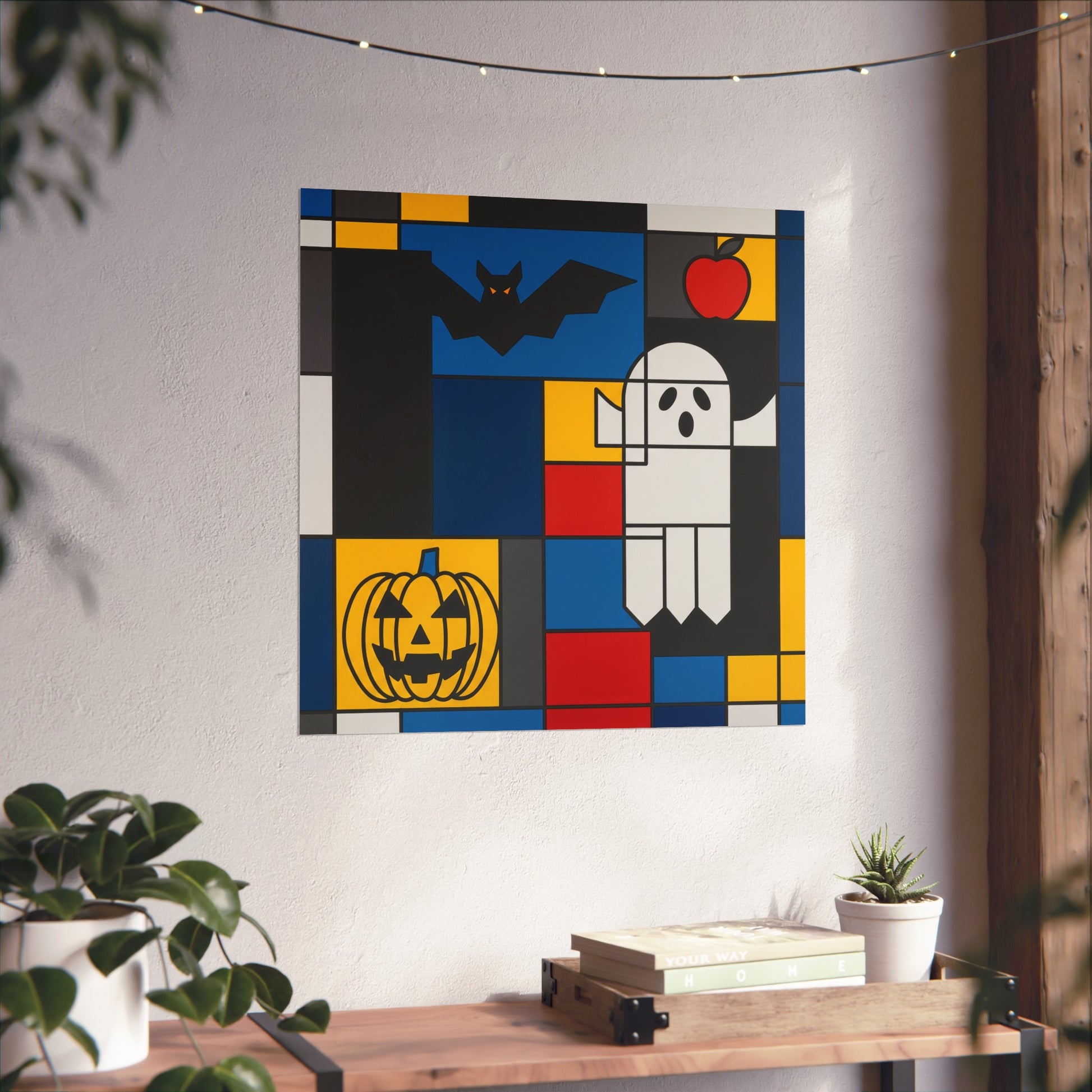 Add a bold, modernist touch to your Halloween décor with this neo-abstract fine art poster. Designed in a Mondrian-inspired grid, this piece features iconic spooky imagery—a jack-o’-lantern, ghost, bat, and apple—set within sharp black lines and vibrant blocks of red, yellow, blue, white, and black. Clean, playful, and contemporary, it transforms Halloween into a work of geometric modern art.